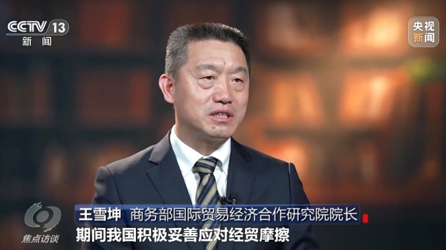 王雪坤院长接受《焦点访谈》采访:“风雨兼程见彩虹” 中国经济巨轮破浪前行 2025-11-10 10:56:00 文章来源:智宣办 近日,商务部研究院院长王雪坤就“十四五”期间中国经济高质量发展接受总台央视《焦点访谈》栏目采访。 王雪坤表示,2020年到2024年,我国出口额由2.6万亿美元增加到3.6万亿美元,增量达到1万亿美元,其间我国积极妥善应对经贸摩擦,外贸发展顶住了一波又一波的单边主义、保护主义冲击,贸易规模在高位保持稳定增长,展现了我国外贸强大的抗压能力和发展韧性。 附:央视《焦点访谈》报道链接(2025年10月18日)