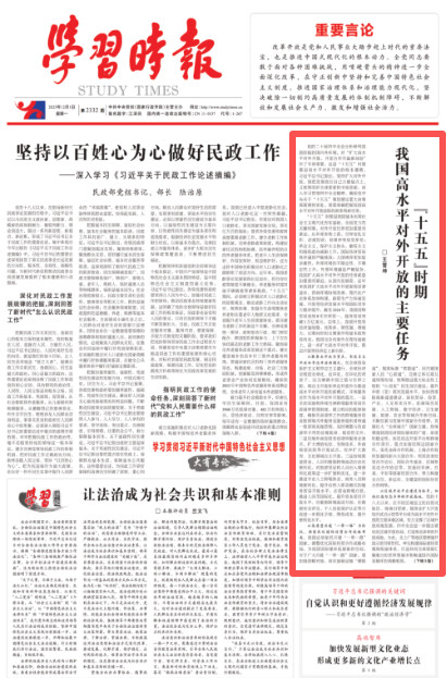 近日,《学习时报》头版刊登商务部研究院院长、党委书记王雪坤署名文章《“十五五”时期我国高水平对外开放的主要任务》,全文如下: